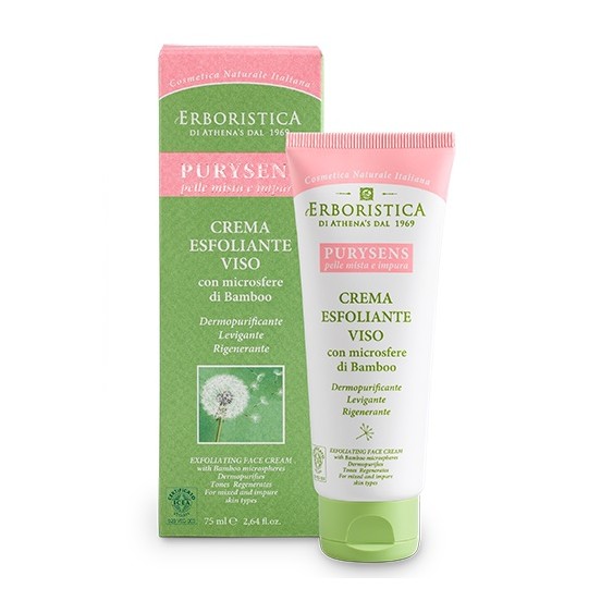 La crema esfoliante viso Purysens dell'Erboristica Athena's è specifica per pelli miste o impure. Utilizzando questa crema due volte a settimana, la delicata esfoliazione delle microsfere libera i pori ostruiti, elimina le cellule morte e il sebo in eccesso, che, occludendo i pori, provoca punti neri e comedoni, bloccando l'ossigenazione e il rinnovamento delle cellule epidermiche. Questo esfoliante in crema offre la massima praticità e gradevolezza d'uso. Efficace anche per pelli acneiche. La formulazione è ricca di ingredienti attivi rigorosamente selezionati per il benessere della pelle soggetta ad impurità. Applicazione: applicare la crema esfoliante una o due volte a settimana, sulla pelle ben detersa e umida di viso e collo, massaggiando delicatamente. Successivamente risciacquare con cura con acqua tiepida. Questo prodotto è privo di elementi derivati del petrolio, parabeni, siliconi, coloranti sintetici, derivati animali.