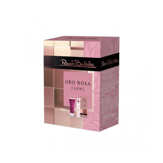 Un cofanetto esclusivo firmato Renato Balestra, ideale per avvolgere la donna in un'aura di eleganza con la fragranza Oro Rosa e la sua lozione corpo abbinata.
