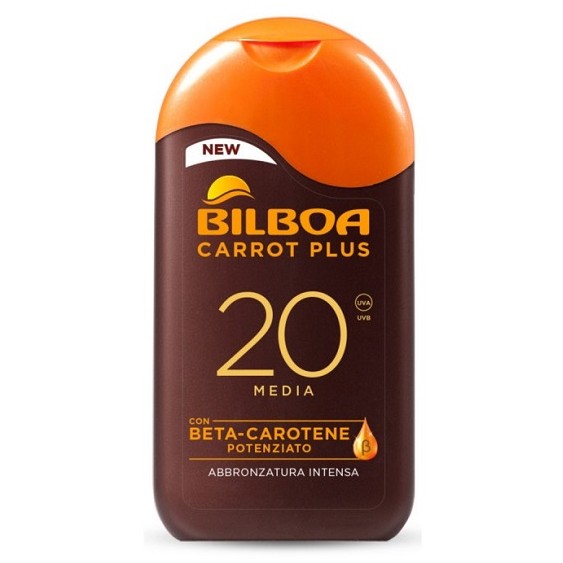 Latte Solare Bilboa Carrot Plus con fattore di protezione 20 ideale per un'abbronzatura intensa e duratura, dona un colorito sublime proteggendo la pelle dai danni del sole. Il Beta-Carotene potenziato regala un'abbronzatura uniforme e dorata più a lungo senza lasciar seccare la pelle.