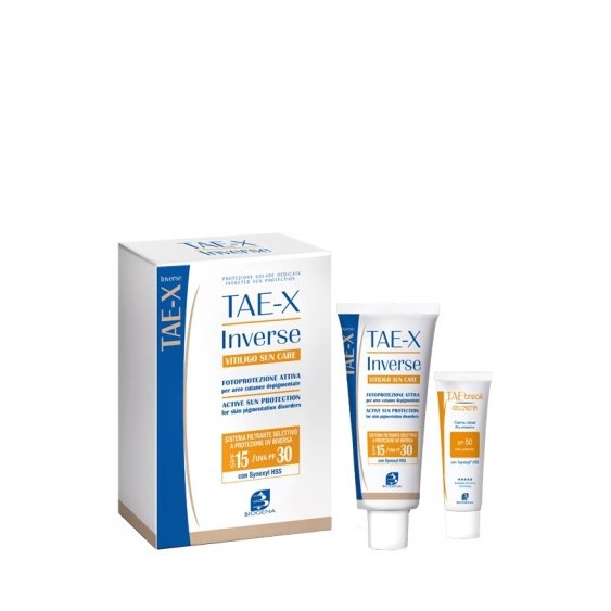 TAE-X Inverse Vitiligo Sun Care è un fotoprotettore attivo per aree cutanee depigmentate. Basato su un innovativo sistema filtrante selettivo a protezione UV Inversa, il nuovo TAE-X Inverse garantisce una protezione media (SPF 15) nel campo UVB e una protezione altissima (UVA PF 30) nel campo UVA svolgendo un'azione coadiuvante nel trattamento elioterapico della vitiligine.