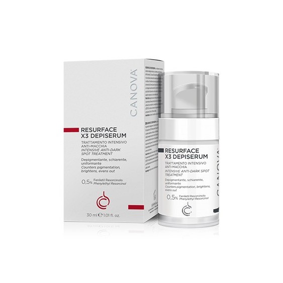 Resurface X3 Depiserum è un trattamento intensivo ad azione depigmentante, schiarente e uniformante dell'incarnato. È a base di Feniletil Resorcinolo allo 0,5% che contrasta la sintesi della melanina e Niacinamide che ne inibisce il trasferimento verso la superficie cutanea, prevenendo la formazione di macchie e contribuendo a correggere quelle esistenti. È arricchito inoltre con un pool di attivi illuminanti e antiossidanti, che donano un aspetto omogeneo al colore della pelle.