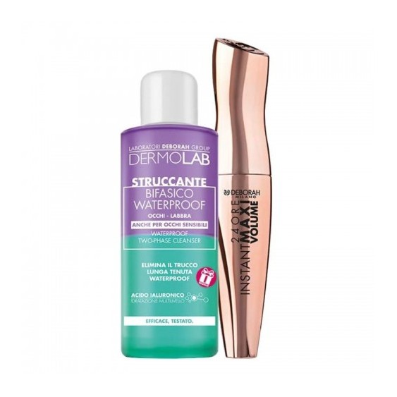 Il Kit di Deborah Milano è composto dal Mascara 24 ore Instant Maxi Volume e dallo struccante bifasico. Perfetto per un look completo e veloce.
