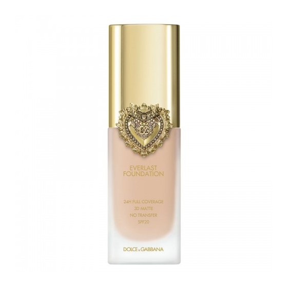 Everlast Foundation è presentato in un ###elegante flacone di vetro###, impreziosito da un ###tappo dorato### sigillato dall'iconico ###Cuore Sacro Dolce&Gabbana###, simbolo di lusso e passione.