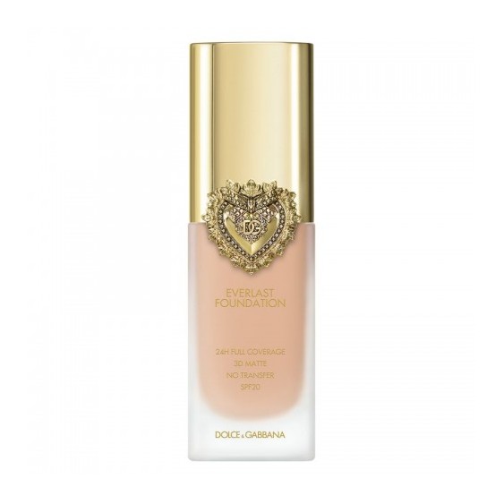 Everlast Foundation è presentato in un ###elegante flacone di vetro###, impreziosito da un ###tappo dorato### sigillato dall'iconico ###Cuore Sacro Dolce&Gabbana###, simbolo di lusso e passione.