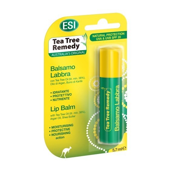 Tea Tree Remedy Balsamo labbra al Limone formulato con ingredienti naturali quali Tea Tree oil (con titolazione superiore al 38% in terpeni totali), olio di Argan, burro di Karitè, vitamina E. Il Tea Tree oil evita gli arrossamenti dovuti agli agenti esterni, quali batteri e virus. L'olio di Argan e il burro di Karitè nutrono le labbra in profondità. La vitamina E ha proprietà antiossidanti. Con fattore di protezione solare SPF 20. Non contiene coloranti, conservanti, parabeni, SLS. Ipoallergenico, dermatologicamente testato.