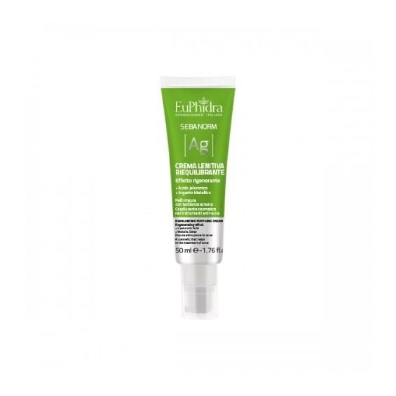 EuPhidra SebaNorm AG, crema lenitiva riequilibrante con argento metallico: azione antibatterica, anti infiammazioni, cicatrizzante. Lenisce irritazioni e arrossamenti, reidrata la pelle e aiuta a prevenire la formazione di imperfezioni. Ideale per le pelli impure con tendenza acneica.