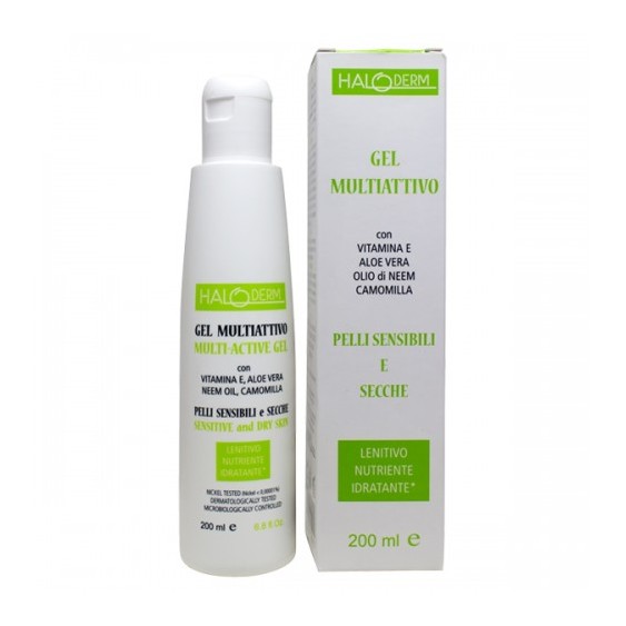 Haloderm Gel multiattivo è formulato con aloe vera gel biologica, olio di NEEM organico, estratto di Camomilla e Vitamine E, dalle proprieta' lenitive, nutrienti e idratanti.