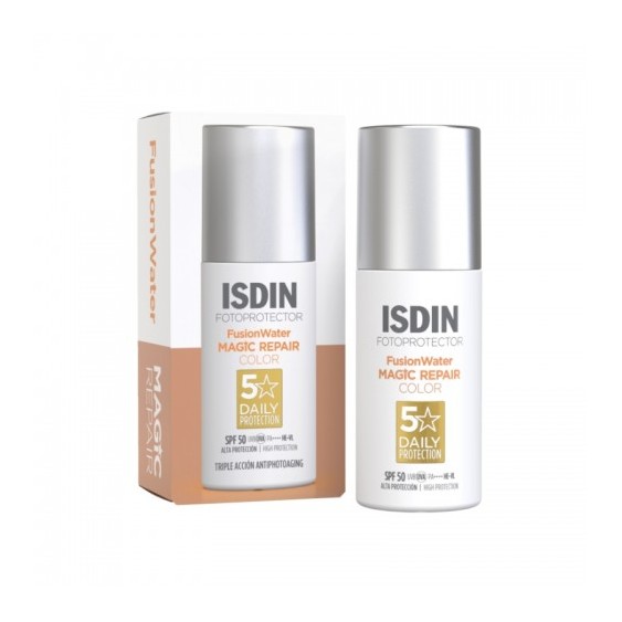 Fusion Water Magic Repair Color SPF50 della linea Fotoprotector di Isdin è una fotoprotezione viso colorata con triplice azione antiphotoaging e protegge la pelle dalle radiazioni solari e dall'inquinamento. Con una fase esterna acquosa e una texture ultraleggera, uniforma l'incarnato, dissimula le imperfezioni e idrata intensamente la pelle.