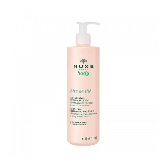 Il Latte Idratante Rigenerante della linea Rêve de Thé di Nuxe è un latte setoso dal tè verde associato a un complesso di zuccheri 100% di origine naturale utile per diffondere un'idratazione 24H. La sua texture fresca e fondente penetra rapidamente, in modo da potersi vestire subito. Il suo delicato profumo apporta ai sensi il pizzico di vitalità del quale hanno bisogno quotidianamente. La fragranza è un profumo rigenerante e irresistibile, con note frizzanti di rabarbaro e di erbe fresche intorno a un rinfrescante cuore di tè.