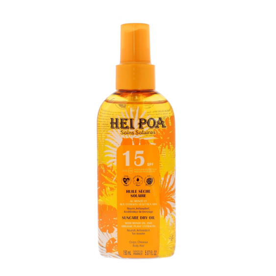 Immergiti in un'esperienza sensoriale unica con l'Olio Secco Solare Spf15 di Hei Poa, un velo protettivo arricchito con Monoi di Tahiti che avvolge la pelle in una setosa idratazione e un delicato profumo di Tiarè.