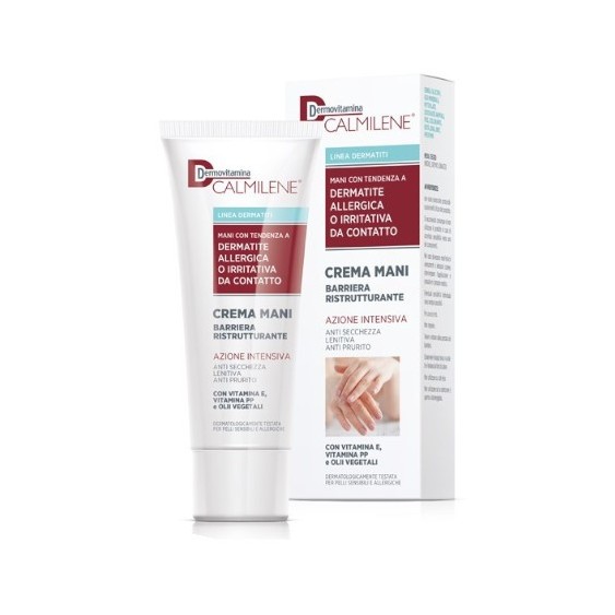 Dermovitamina Calmilene Crema Mani Barriera Ristrutturante ad azione protettiva per la pelle dalle aggressioni esterne: previene la secchezza, la disidratazione e la formazione di screpolature, spaccature e fissurazioni delle mani dovute a contatto con elementi chimici e prodotti aggressivi oppure in caso di sensibilità individuale, di allergie e intolleranze a prodotti chimici e metalli. Particolarmente indicata per persone che soffrono di irritazioni da contatto o irritazioni da allergie, sia nell'ambiente lavorativo per esposizione ad elementi esterni sia nel caso di dermatiti dovute ad ipersensibilità individuali. Mantiene e ripristina la barriera epidermica grazie ai lipidi contenuti, rende la pelle elastica ed idratata. È ricca di vitamina E, vitamina PP e olii vegetali, ideali per mantenere morbida ed elastica la pelle.