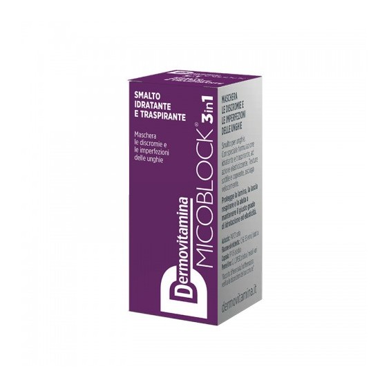 Dermovitamina Micoblock 3 in 1 è uno smalto pratico, funzionale e semplice da usare. Texrture sottile e coprente, asciuga velocemente e maschera le imperfezioni delle unghie. Con speciale formulazione idratante e traspirante, ad azione elasticizzante.