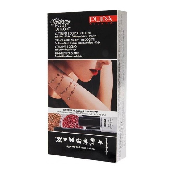Un kit esclusivo per decorare il corpo con body jewels splendenti e a lunga durata. Ogni kit contiene: GLITTER PER IL CORPO: 2 colori ultra brillanti per tatuaggi preziosi e scintillanti. STENCIL AUTO-ADESIVI: 8 soggetti ultra glamour riutilizzabili. Facili da usare e da rimuovere senza irritare la pelle. COLLA PER CORPO: per tatuaggi resistenti all’acqua e a lunga durata. PENNELLO PER GLITTER: ideale per applicare i glitter sul corpo con precisione. Clinicamente testato. Per uso esterno