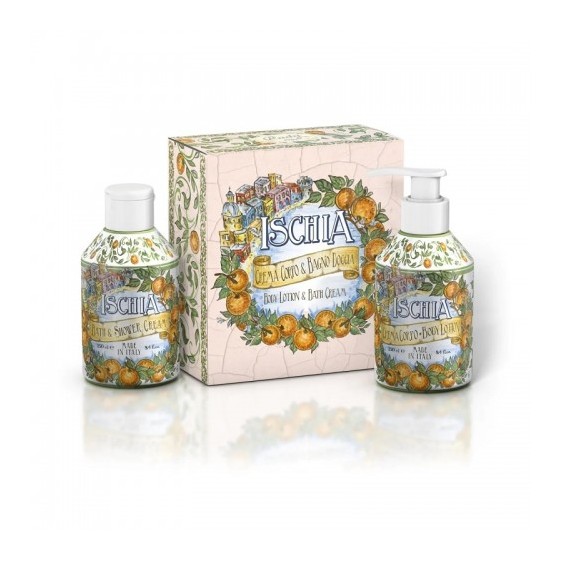 Cofanetto regalo composto da un bagno doccia ed una crema corpo della linea Ischia, caratterizzati da note frizzanti di bergamotto e arancio addolcite da un cuore fiorito di gardenia e rosa.