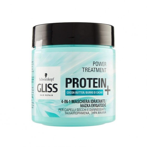 La Maschera Idratante Gliss 4in1 Power Treatment di Schwarzkopf, grazie alla sua formula con Proteine e Burro di Cacao, rispetta la naturale idratazione del capello e previene i capelli spezzati.
