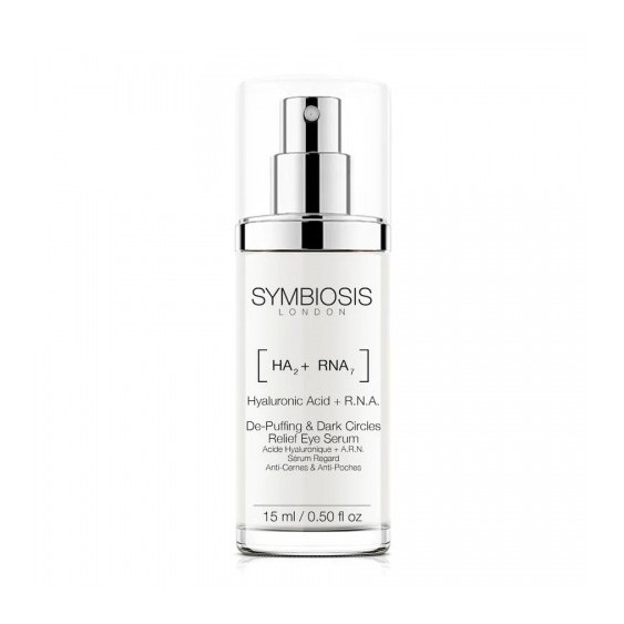 Symbiosis De-puffing & Dark Circles Relief Eye Serum infuso con ingredienti idratanti e anti-invecchiamento tra cui acido ialuronico, R.N.A. e collagene e si assorbe rapidamente nella pelle contribuendo a lasciare la zona degli occhi liscia come la seta.