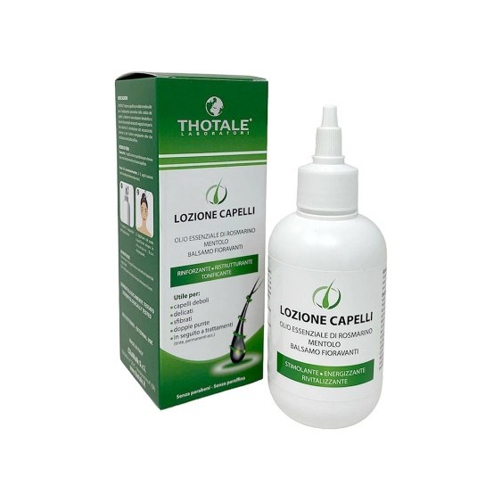 Thotale Lozione Capelli è una soluzione idroalcolica a base di oli essenziali di Rosmarino, Mentolo e Balsamo Fioravanti. Questo prodotto è ideale per il trattamento preventivo della caduta dei capelli, capelli deboli, delicati, sfibrati e con doppie punte, nonché per i capelli trattati con tinte o permanenti.