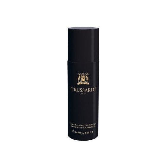 Trussardi Uomo Deodorant spray, contenuto in una confezione total black con dettagli dorati è caratterizzato da note fortemente maschili, fougère-legnose; inizialmente frizzanti e aromatiche come il succo di limone fresco e il bergamotto che dialogano poi con quelle speziate di noce moscata e salvia sclarea per concludersi con la forte mascolinità di cuoio, muschio e patchouli.